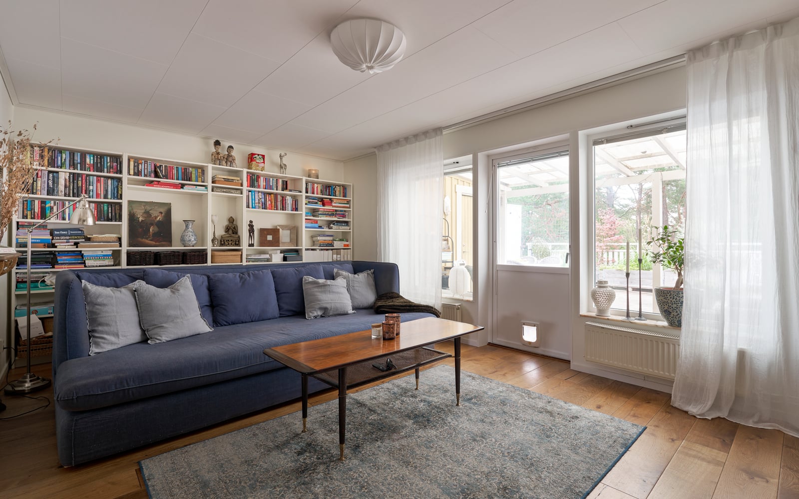 Vidare in i hemmet öppnar sig vardagsrummet – ett luftigt rum med stora fönster, enstavsparkett och gott om plats för soffgrupp och tv-möbel. Härifrån nås den stora altanen, med både takskyddad yta och plats i det fria, helt utan insyn och med naturen alldeles intill.