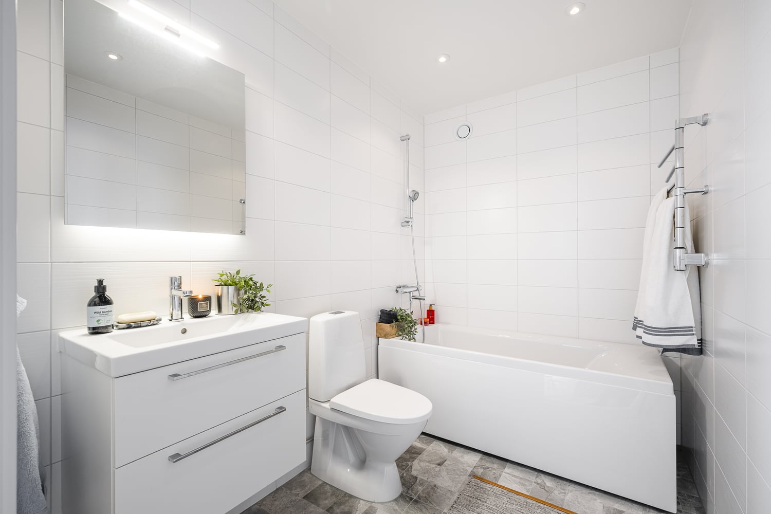 I anslutning till hallen ligger lägenhetens två badrum och den egna tvättstugan. Alla dessa rum är utrustade med vita kaklade väggar, sobert matchade av ljust grå golvklinker med golvvärme. Det största badrummet är utrustat med badkar, handdukstork med värme, stort handfat i kommod och WC. Behagligt ljus i form av infällda spotlights i taket. Det mindre badrummet är utrustat med dusch bakom klarglasvägg, handfat i kommod samt WC. Tvättstugan är utrustad med tvättmaskin och torktumlare under arbetsbänk med förvaringsskåp över. Separat tvättho i arbetsbänk.